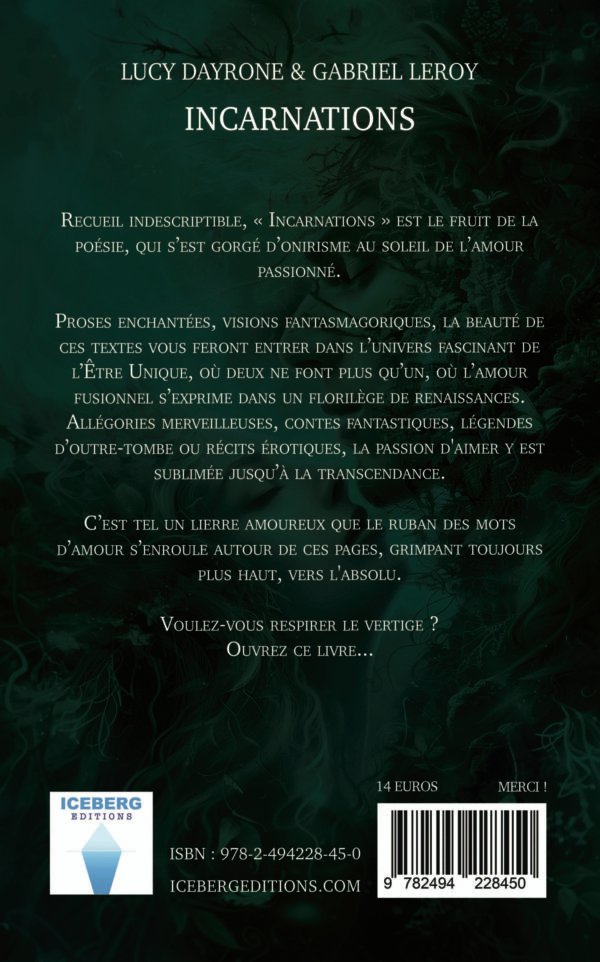 Proses enchantées, visions fantasmagoriques, la beauté de ces textes vous feront entrer dans l’univers fascinant de l’Être Unique, où deux ne font plus qu’un, où l’amour fusionnel s’exprime dans un florilège de renaissances.